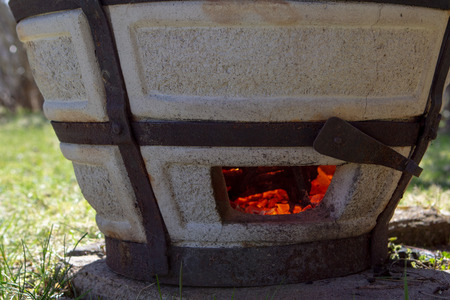 Tandyr with fire oven close up photo on the summer outdoor green garden background