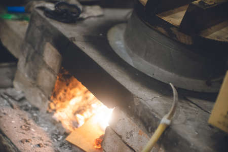 Licking flame from fire charcoal in thai traditional stove with pine stick