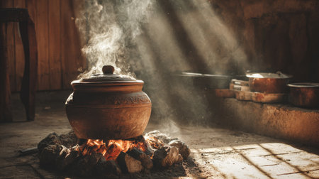 A rustic kitchen scene featuring a steaming clay pot cooking over an open fire. Sunlight rays filter through, creating a warm and inviting atmosphere perfect for culinary creations.