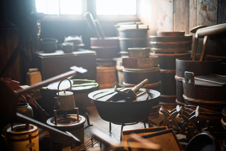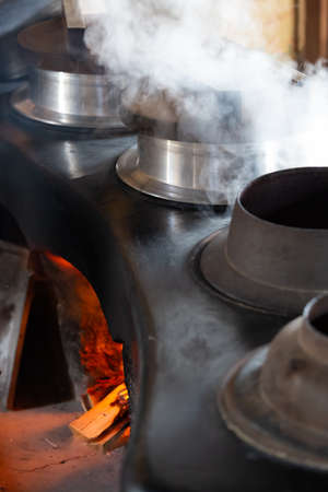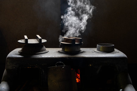 Japanese traditional house, cooking over a wood fire in a kitchen kamado with a dirt floor