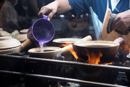 Kuala Lumpur, Malaysia - Jun 07, 2022: Claypot meal preparation using charcoal fire on the street of Chinatown in Kuala Lumpur