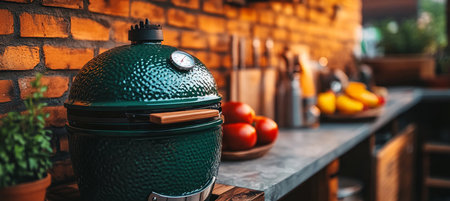 Outdoor Kitchen Corner Green Ceramic Grill And Fresh Vegetables On Countertop Near Brick Wall