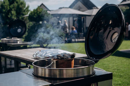 charcoal with smoke in shiny stainless steel barbecue with lid open