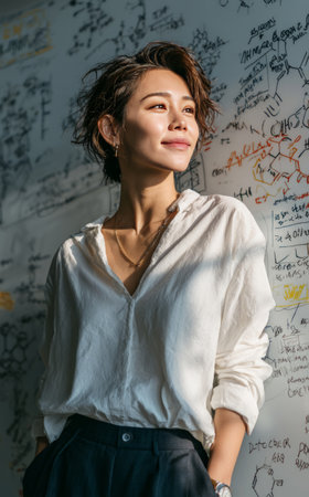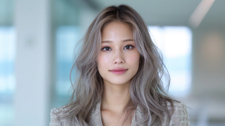 Portrait of an Asian woman with natural makeup and soft wavy hair, wearing a white shirt. the subtle background enhances the sophisticated and minimalistic styling, perfect for professional or editorial purposes.