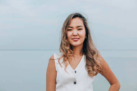 Asian woman smiling and looking at camera on a calm lakeside, dressed in white outfit, displaying a confident and cheerful emotion, concept of wellness, skincare, personal development