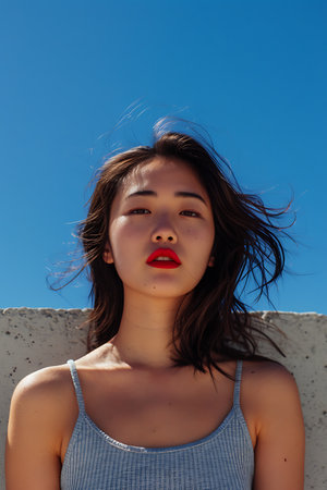 A stunning portrait of a Japanese model with elegantly curled hair, wearing a stylish outfit.