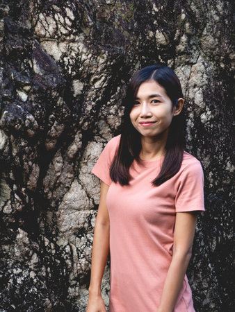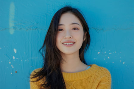 Pretty Asian individual with a warm, inviting smile, background for copy space or marketing purposes