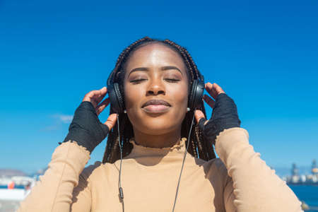 Closeup portrait of young black afro girl smiling with headphones and blue sky background, pretty afro girl transmitting positivity and peace.