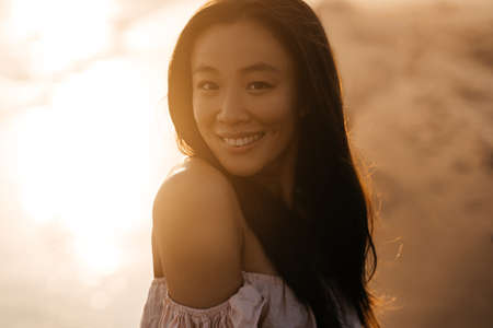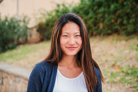 Close up individual portrait of chinese young woman smiling and looking at camera ourside. Front view of asian teenage female with friendly attitude. Head shoot of positive lady