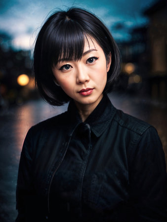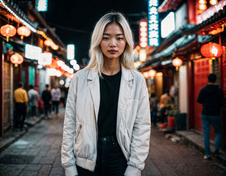 portrait of beautiful asian woman in casual outfit at night, generative AI