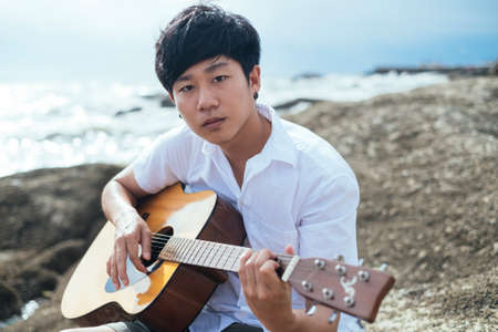 Musician guy in white shirt playing guitar while he sitting on a rock next to the sea.