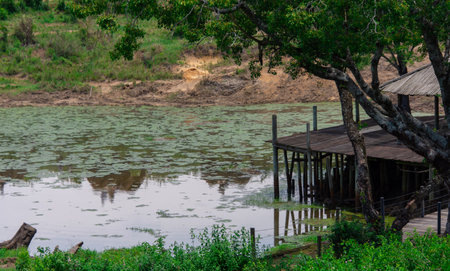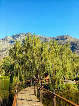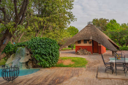 NELSPRUIT, SOUTH AFRICA - MAY 3, 2019: A viewing platform, lapa and lake at the Lakeview Lodge and Caravan Park at Nelspruit in the Mpumalanga Province