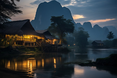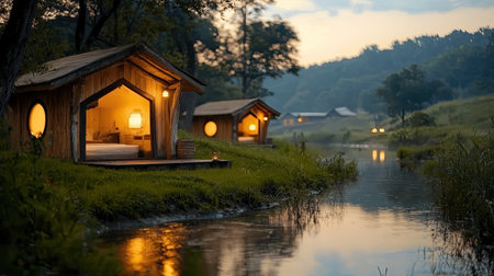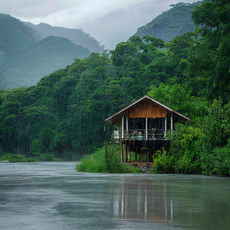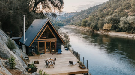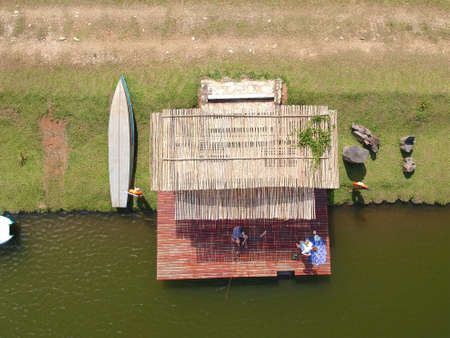 Aerial view of beautiful little wood cabana next the water of a lake, fisher on the dock of the little hut trying to catch fish. relax moment next the water in the sun.