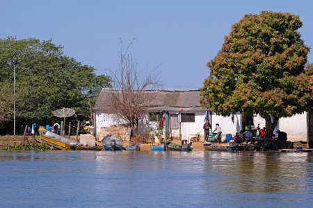 CORUMBA, MATO GROSSO, BRAZIL, JULY 23, 2018: Traditional indigenous fishermen along the Rio Paraguay river, Pantanal, near Corumba, Mato Grosso Do Sul, Brazil, South America