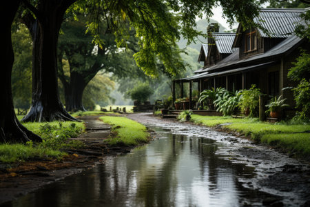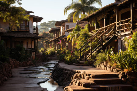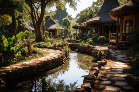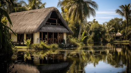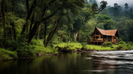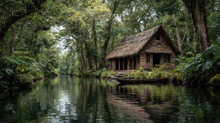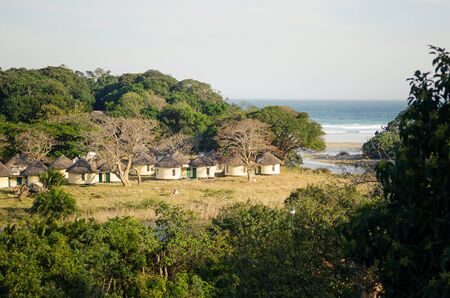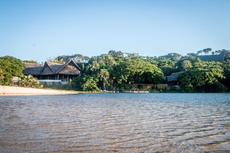 Picture of buildings in the forest by a lagoon, Swahili coast, Tanzania.