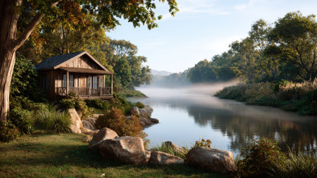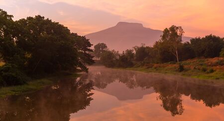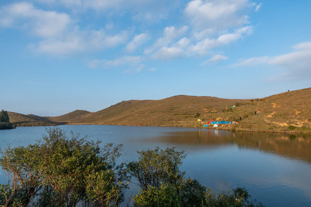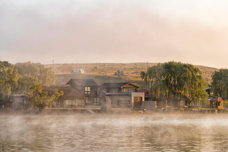 VREDE, SOUTH AFRICA - MAY 2, 2019: Holiday homes are visible through the mist at sunrise on the dam at Vrede, in the Free State Province