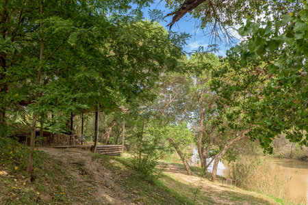 KRUGER NATIONAL PARK, SOUTH AFRICA - MAY 4, 2019: A view of the Nkuhlu Picnic Site and the Sabie River in the Kruger National Park. Benches are visible
