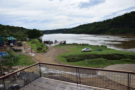 View of the river and boats near the shore, view from the observation deck in Puerto Iguazu. Argentina