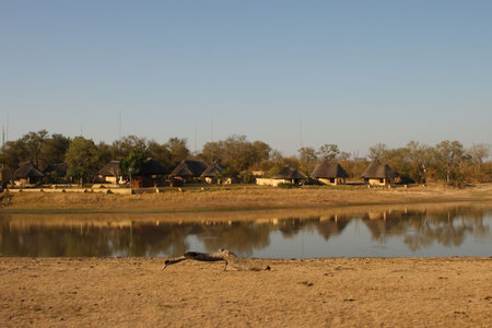 KRUGER NATIONAL PARK, SOUTH AFRICA - MAY 4, 2019: An elevated view of the Nkuhlu Picnic Site and the Sabie River in the Kruger National Park