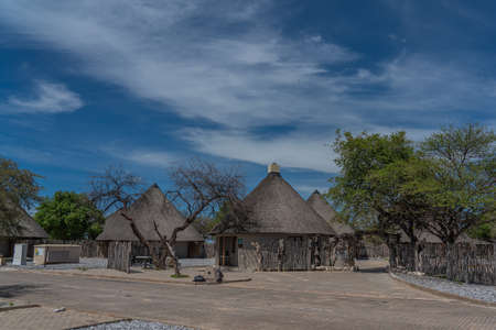 Etosha National Park 05 October 2018: Lodge at Okaukuejo Camping Area. Buildings with thatched roofs.