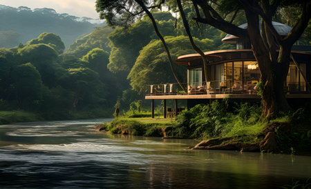 HAZYVIEW, SOUTH AFRICA - OCTOBER 1, 2018: Wooden pool deck which overlooks the Sand River in Singita Ebony Lodge located in Sabi Sands Game Reserve, South Africa
