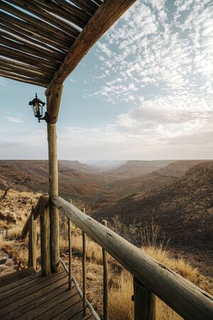 View from one of the private luxury rooms at the Grootberg Lodge, Grootberg Plateau made out of local materials. Namibia, Africa
