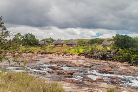 Yuruani river in Gran Sabana region in National Park Canaima, Venezuela. Indigenous village in the background.