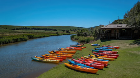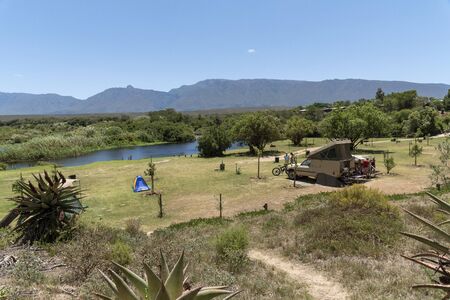 Swellendam, Western Cape, South Africa, December 2019. Campsite on the Breede River viewd from Aloe Hill on the Garden Route.