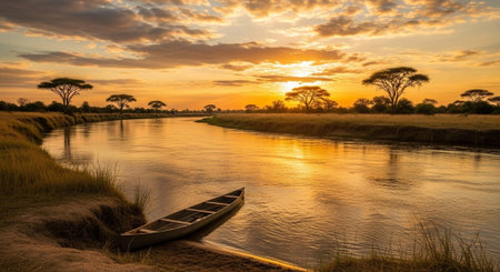Sunset in South African Etosha park on the shore of the lake in the middle of wild nature. Namibia