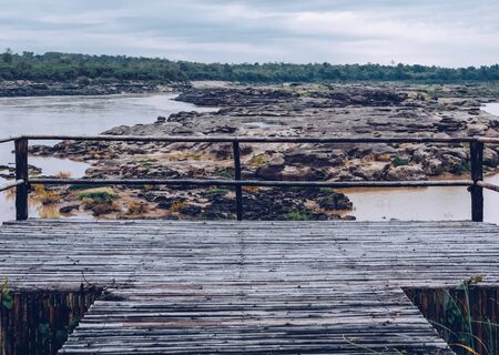 River sunset landscape with beautiful clouds, water reflection and wooden deck, path