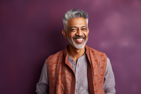 Portrait of a happy Indian man smiling at camera while standing against purple background