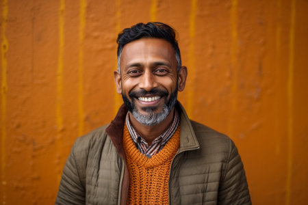 Portrait of a happy indian man smiling at camera against orange wall