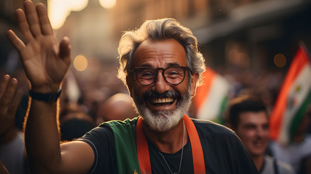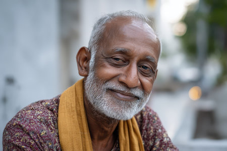 Portrait of a cheerful senior Indian man wearing a colorful kurta, showcasing cultural heritage and positive aging