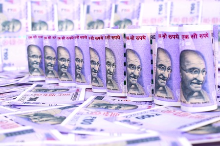 currency of India: close up of several Indian rupee banknotes
