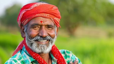 A cheerful elderly man wearing a red turban and a checked shirt smiles warmly amidst a lush green field, showcasing rural life and tradition.