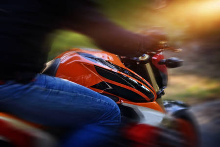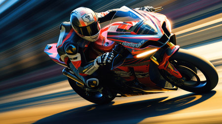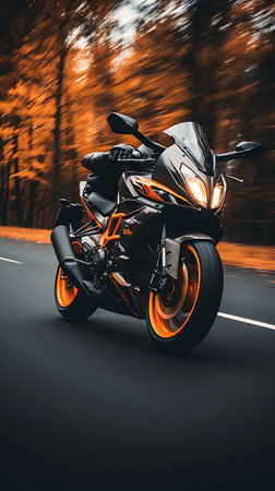 A thrilling dynamic shot of a motorcycle rider speeding along a scenic road. The blurred background creates a sense of motion, emphasizing adventure, freedom, and excitement in a stunning outdoor setting.