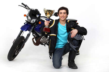 Teenager with gold cup in front of a motorbike
