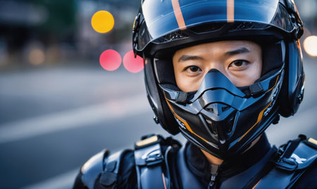 A man wearing a motorcycle helmet looks intently at the camera, with a blurred cityscape in the background