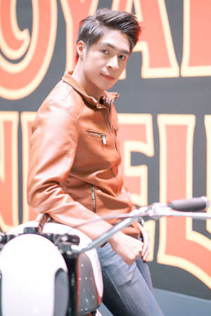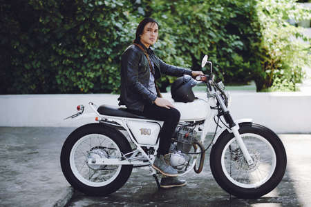Profile view of middle-aged Asian rider wearing black leather jacket posing for photography while sitting on vintage motorbike outdoors, full length portrait