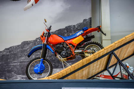 SINSHEIM, GERMANY - OCTOBER 16, 2018: Technik Museum. Red luxury classic motorcycle with person stands behind. Cropped photo.