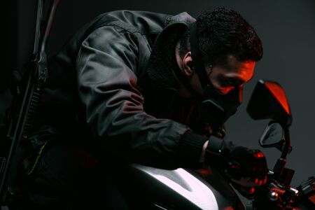 selective focus of dangerous mixed race cyberpunk player in mask riding motorcycle on grey