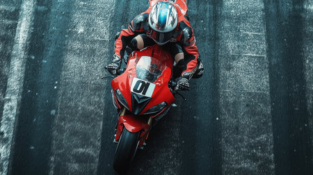 A skilled motorcycle racer, attired in red racing gear, expertly navigates a curve on a race track. The asphalt glistens under bright sunlight while the motorbike zips along, embodying speed and adrenaline.