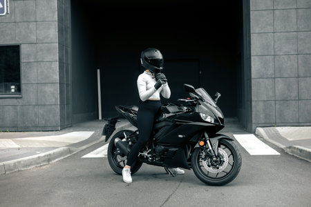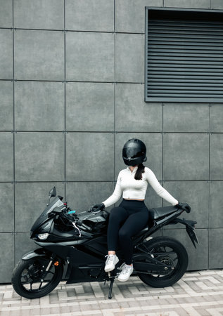 Biker girl in sportswear sitting on a black motorbike