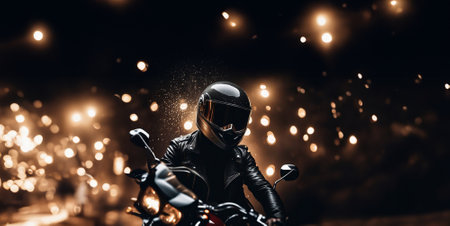 Biker riding a motorcycle on night city street. Biker in black leather jacket and helmet.