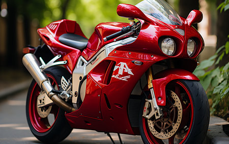 red motorcycle stands on the road alone near the forest