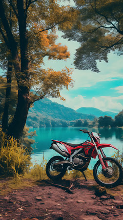 Beautiful view of a mountain lake with a motorcycle in the foreground