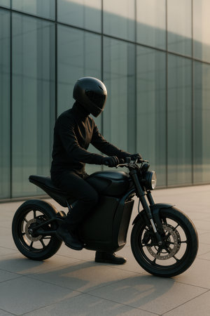 Modern motorcyclist in black helmet and clothing sitting on dark bike near glass building. Urban transport security anonymity and night ride atmosphere.
