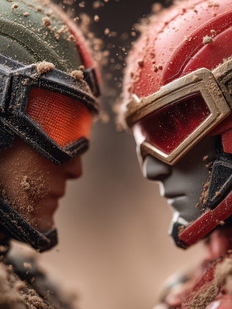 This close-up image features two action figures in an intense standoff surrounded by sand, showcasing intricate details and vibrant colors. The focus on their faces reveals emotions of rivalry and tension, perfect for a creative project.