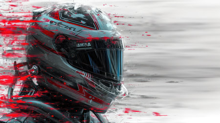 Racing driver wearing a helmet and suit, adjusting visor with hands, showing determination and focus during pre race preparation for motorsport competition