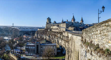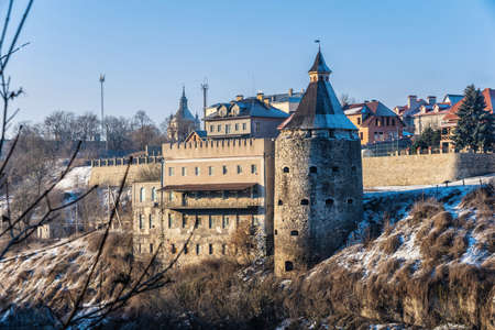 Kamianets-Podilskyi, Ukraine 07/01/2020. Panoramic view of the Kamianets-Podilskyi fortress on a sunny winter morning